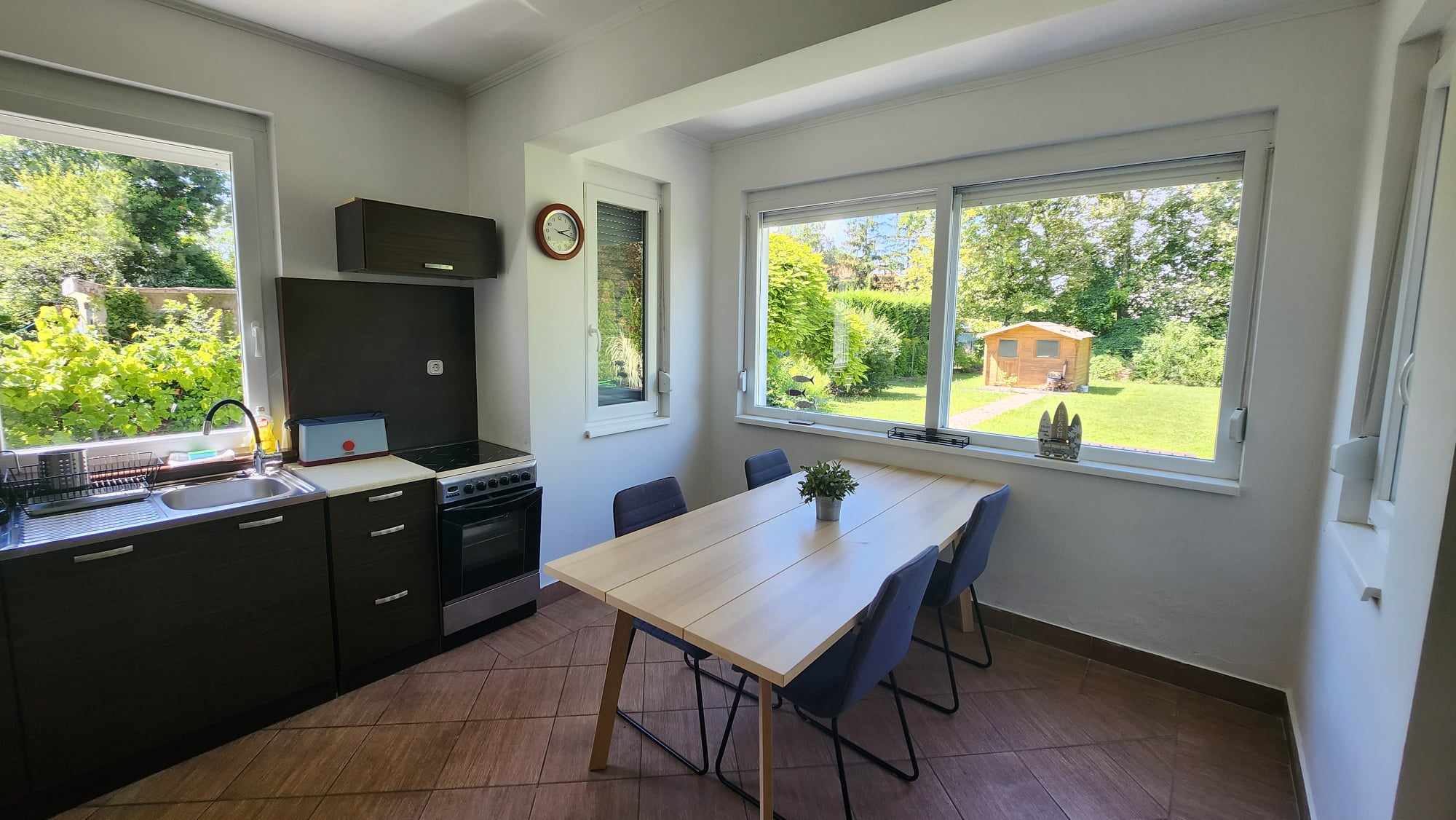 A vendégek számára a kertrész felöli oldal az ami a rendelkezésükre áll, ahol kerti kiülős, napozóágy és grillezési lehetőség is biztosítva van.
