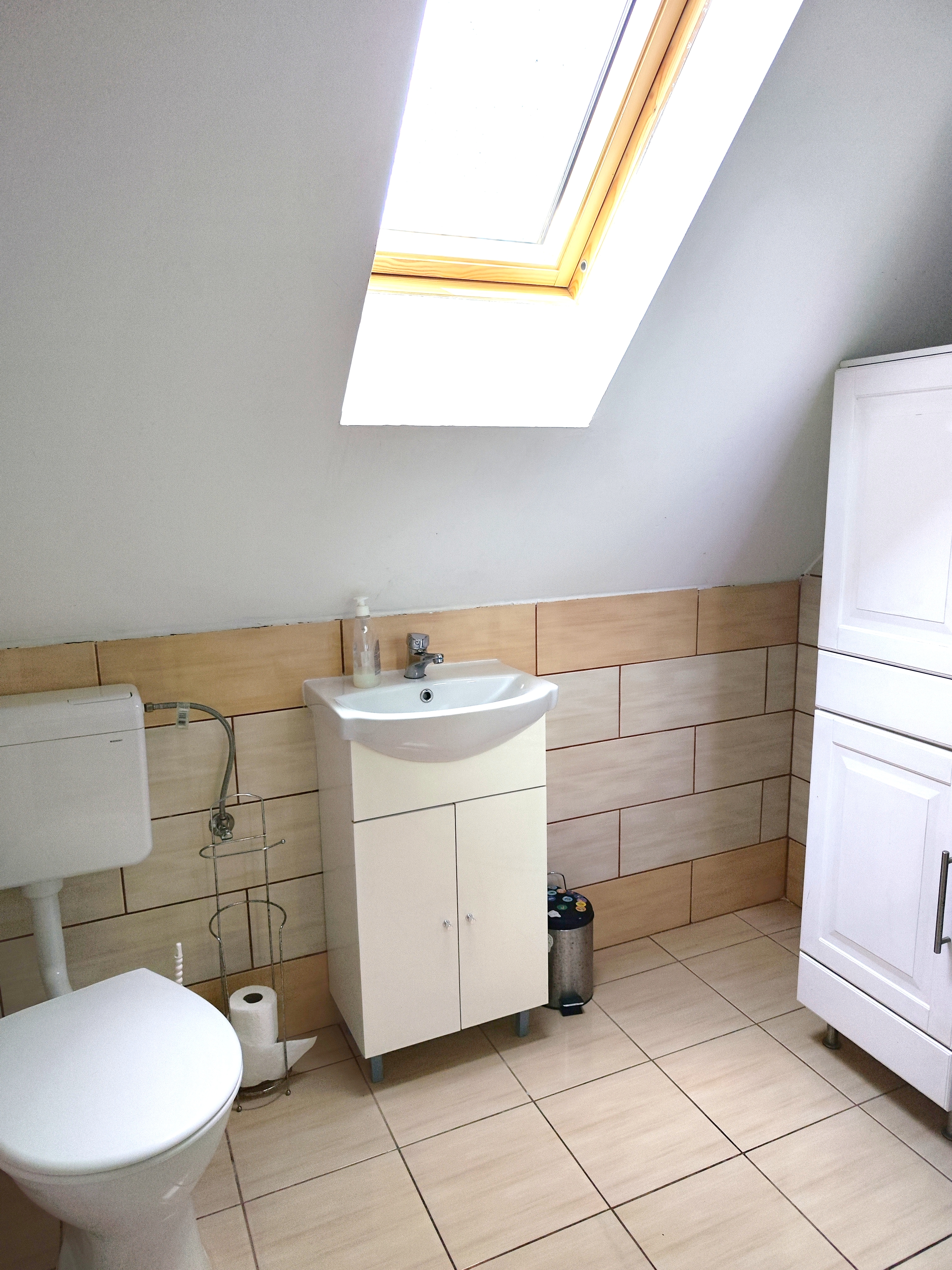 Az alsó szinten a zuhanyzó és a wc külön helységben , az emeleten pedig a fürdő és a wc egy helységben található.