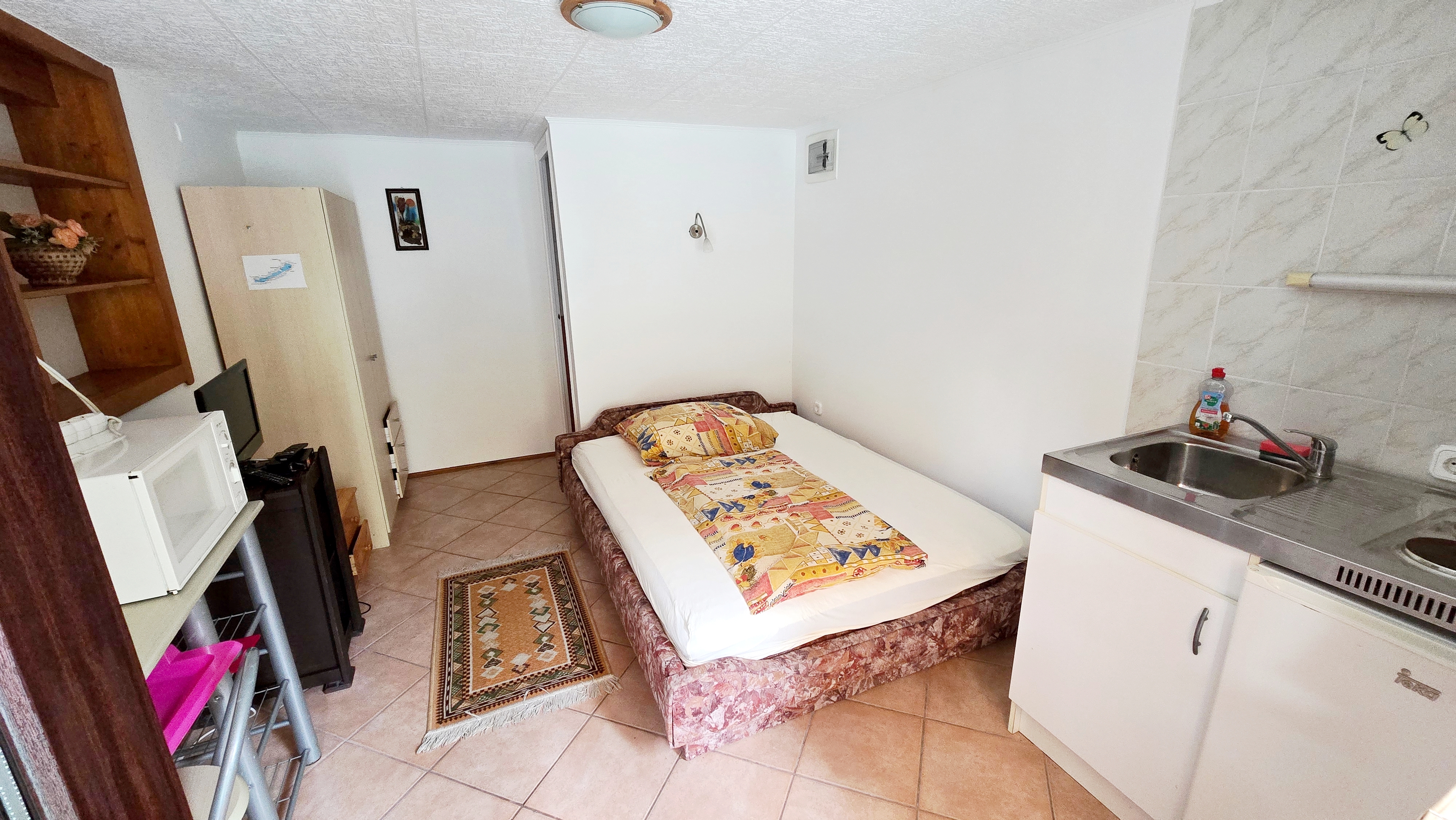 Egy szobás kis lakrész, mely rendelkezik egy kicsi konyharésszel, egy dupla ággyal, tartozik hozzá egy fürdőszoba wc-vel, valamint egy kis kiülős rész is.